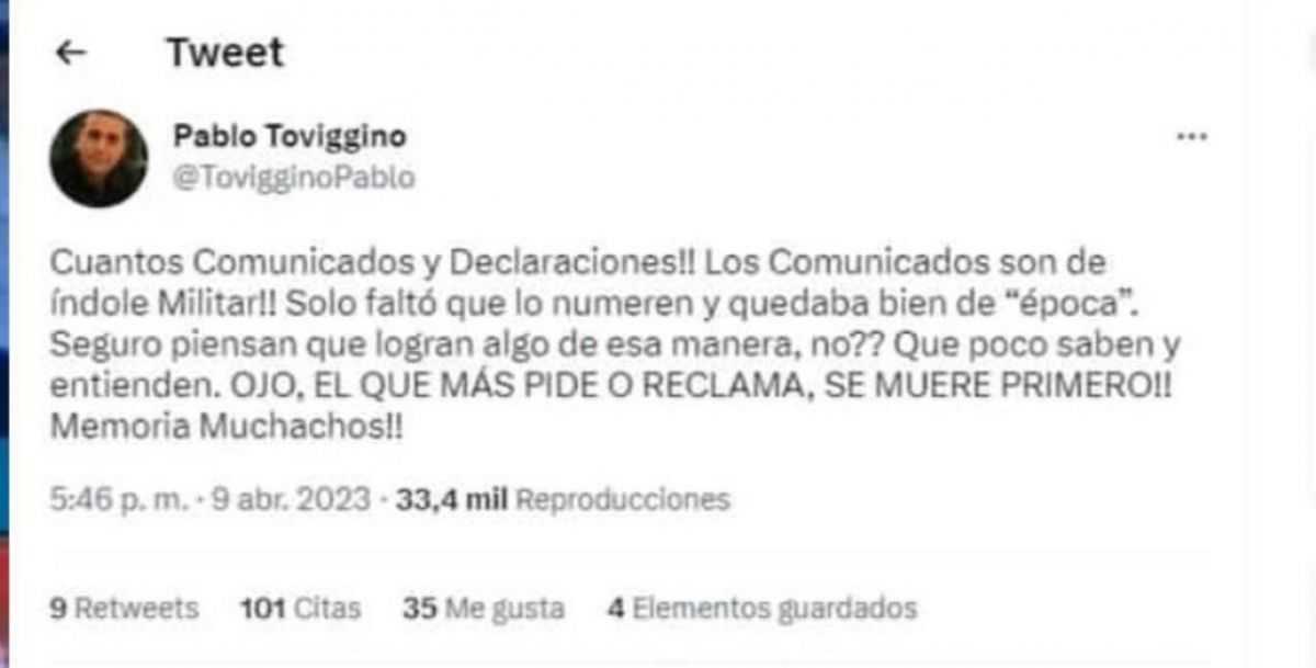 "Existirá la posibilidad, para que los Comunicados sean firmados con nombre y apellido? Porque resulta sospechosa su veracidad en cuanto al 'autor'. No voy a decirles que el 'que más pide se muere primero' pero una vez, SEPAN RECONOCER SUS ERRORES y la próxima PATEEN AL ARCO!!!...." publicó esta mañana Toviggino en su cuenta de Twitter.