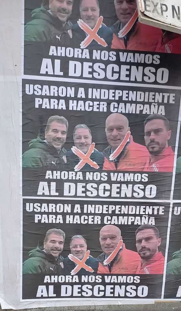"Usaron a Independiente para hacer campaña, ahora nos vamos al descenso", dice el afiche también anónimo.
