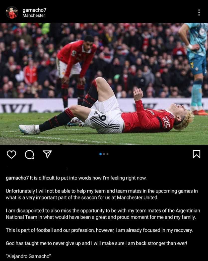 En un mensaje publicado en su cuenta de Instagram, el prometedor atacante, de 18 años, confirmó que no podrá estar en los partidos del campeón del Mundo contra Panamá y Curazao del 23 y 28 de marzo, respectivamente. "Es difícil poner en palabras cómo me siento en este momento. Desafortunadamente no podré ayudar a mi equipo y a mis compañeros en los próximos partidos, en lo que es una parte muy importante de la temporada para nosotros en el Manchester United", inició Garnacho su mensaje.