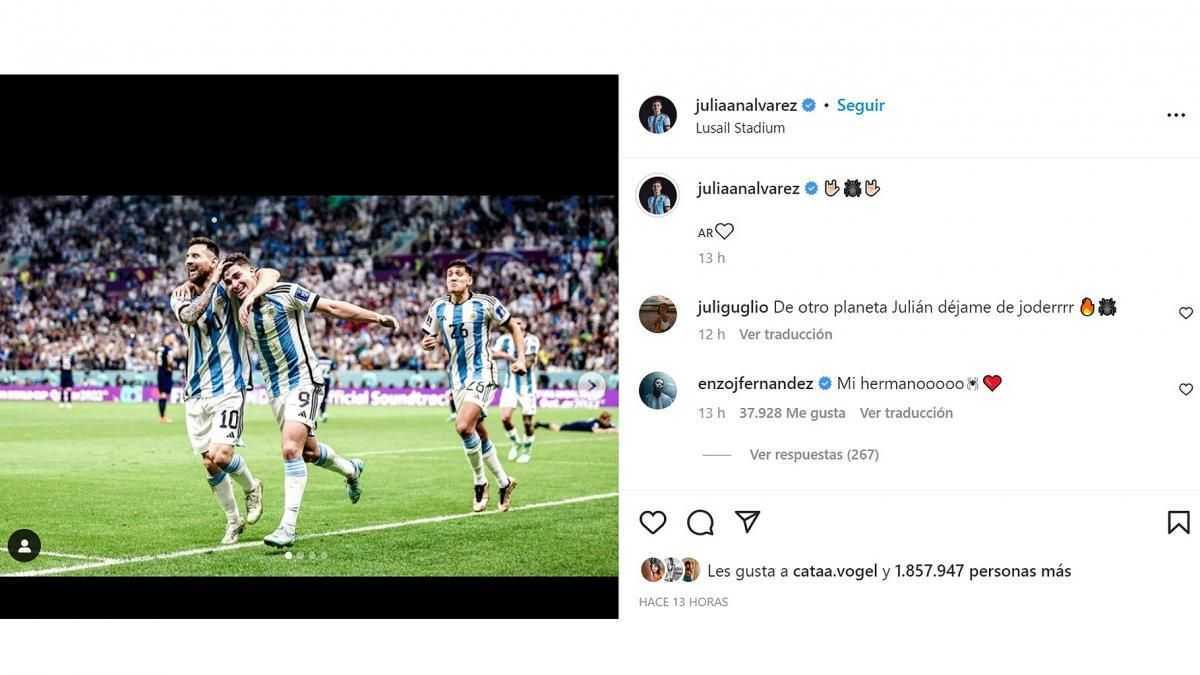 “Un pasito más, todos juntos. ¡Que alegría! GRACIAS, SIEMPRE GRACIAS A TODO EL PUEBLO ARGENTINO”, fue la frase que usó el goleador Julián Álvarez junto a una foto del festejo en el vestuario, una publicación que fue acompañada por cuatro corazones azules de Marcos Acuña y un comentario cómplice de “Papu” Gómez: “Pique piqueeeeeee”, en alusión a la corrida del delantero que terminó en el segundo gol argentino.