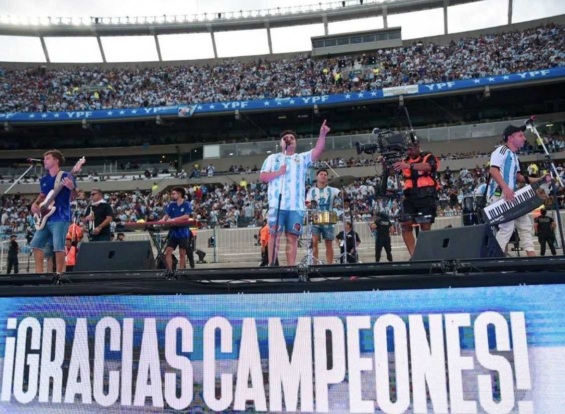 La banda liderada por Juani Giorgetti se presentó en vivo con seis músicos en el escenario e inició su número interpretando la canción de cancha "Vamos Argentina, sabes que yo te quiero..." que levantó nuevamente al público.
